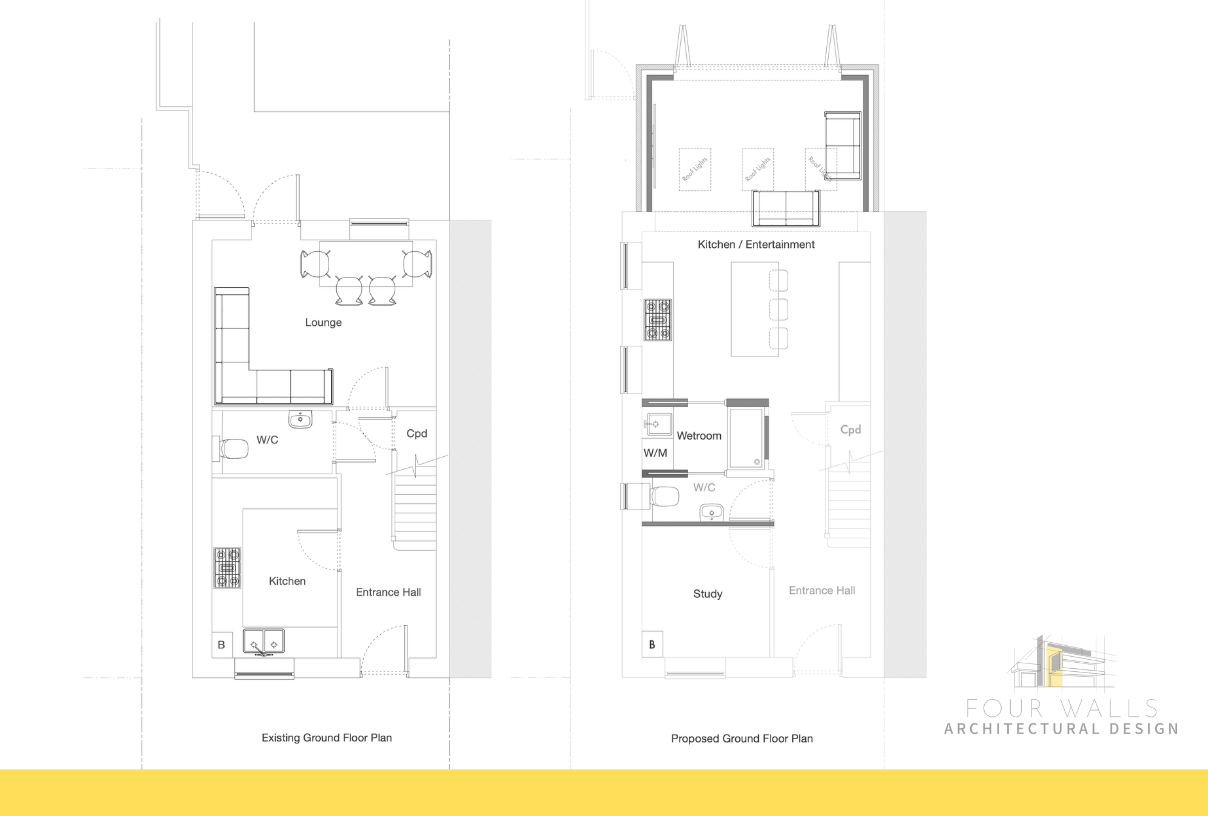 These two auction homes were purchased together. Left in a derelict state offering a very small living area, we re-designed the layouts to accommodate modern needs. A simple extension to the rear provided plenty of space for a medium-sized family, making it more appealing on the market.